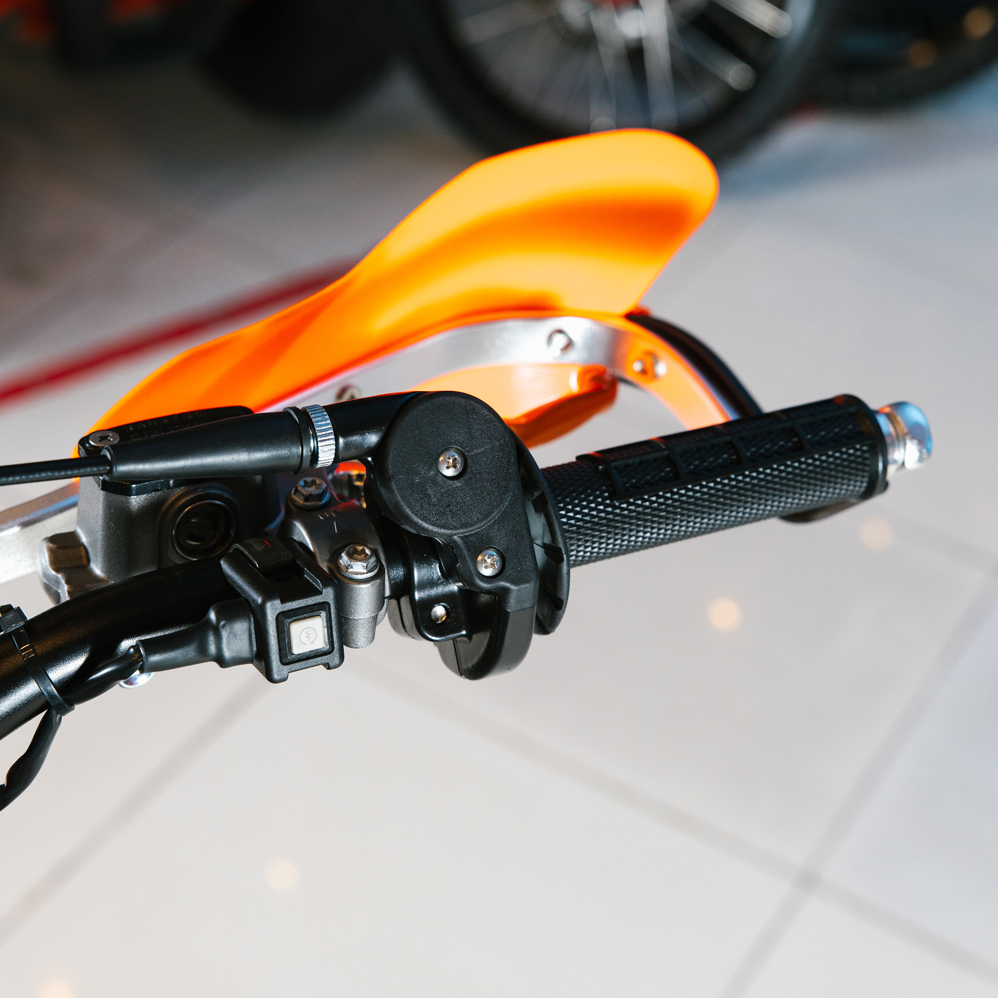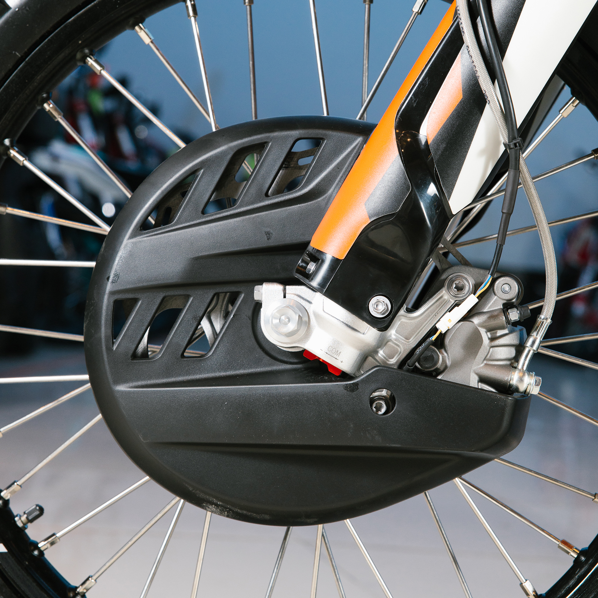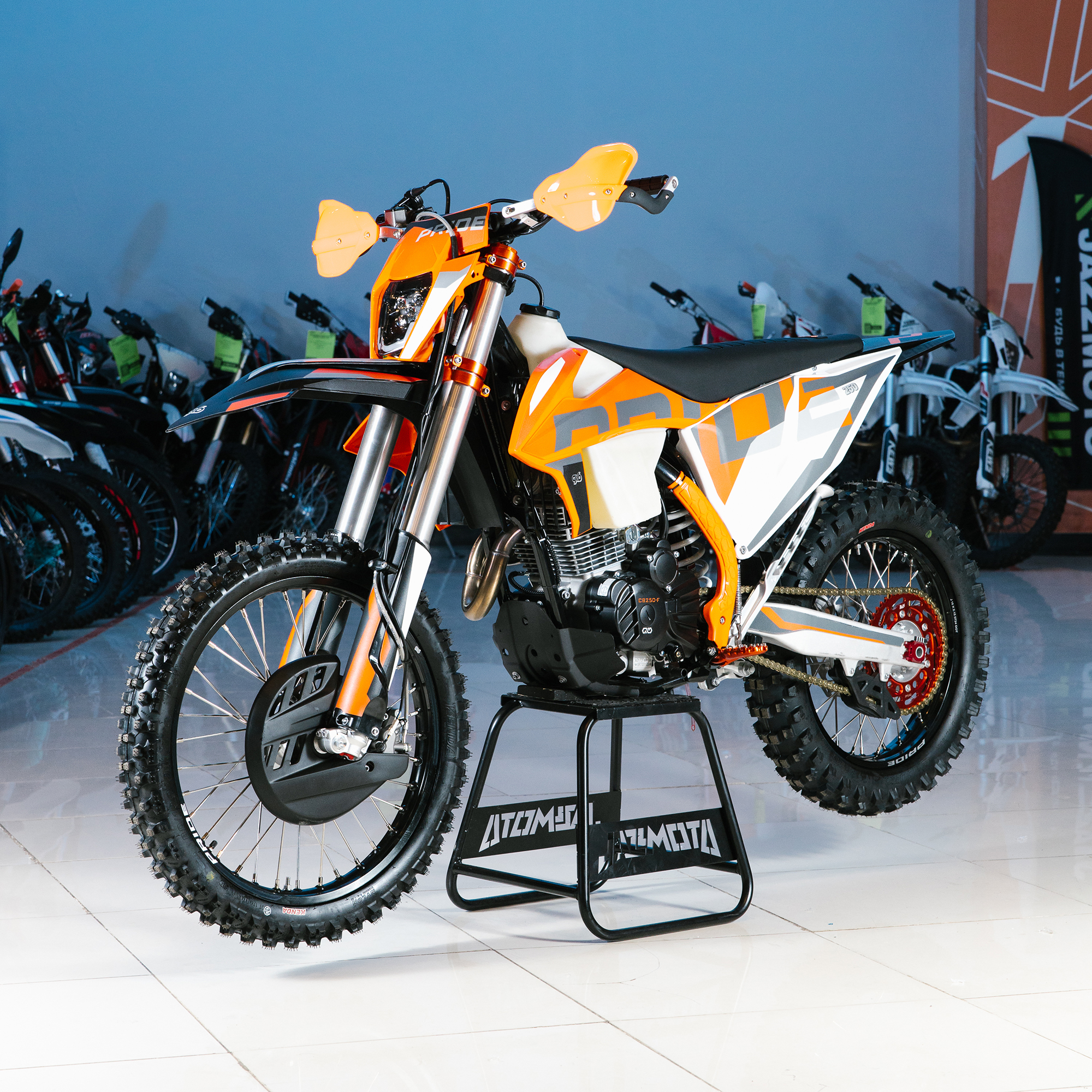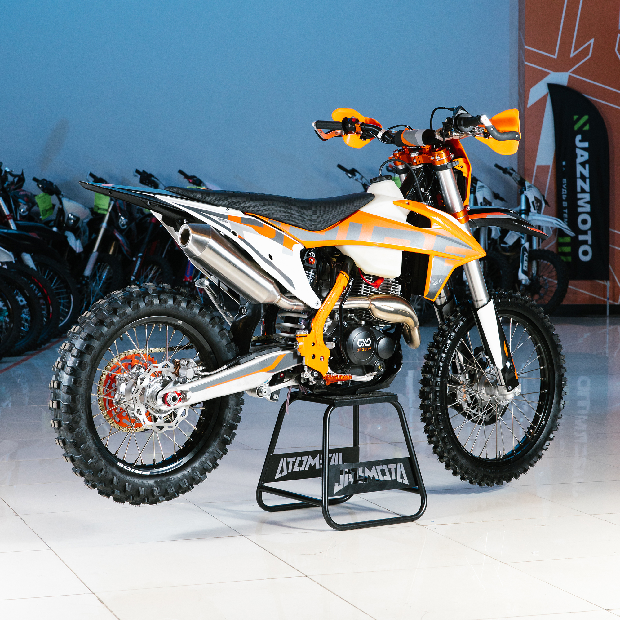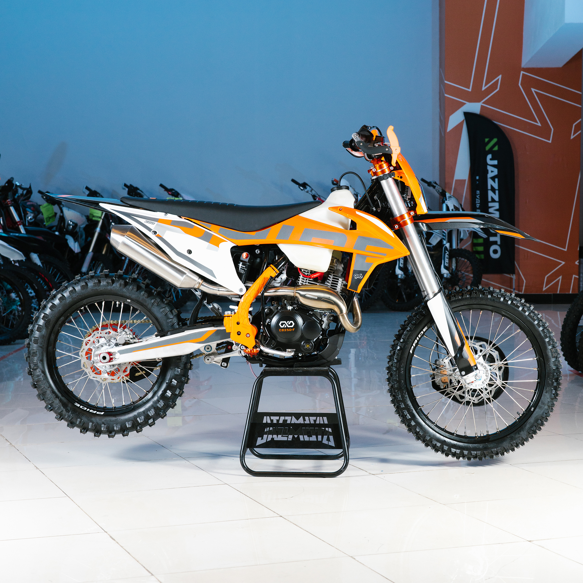 Спереди и сзади установлены антибуксаторы бренда "AJ1", которые притягивают покрышку к ободу, позволяя ездить по бездорожью при низком давлении в камерах, не давая покрышке проворачиваться во время езды. Размер передней покрышки: 80/100 R21. Размер задней покрышки: 120/90-R18. Модель комплектуется "жирной" резиной "KENDA". Все эти характеристики позволяют мотоциклу отлично себя чувствовать в песке и грязи.