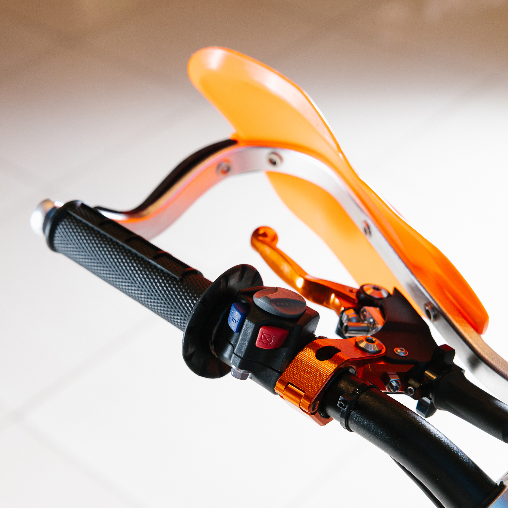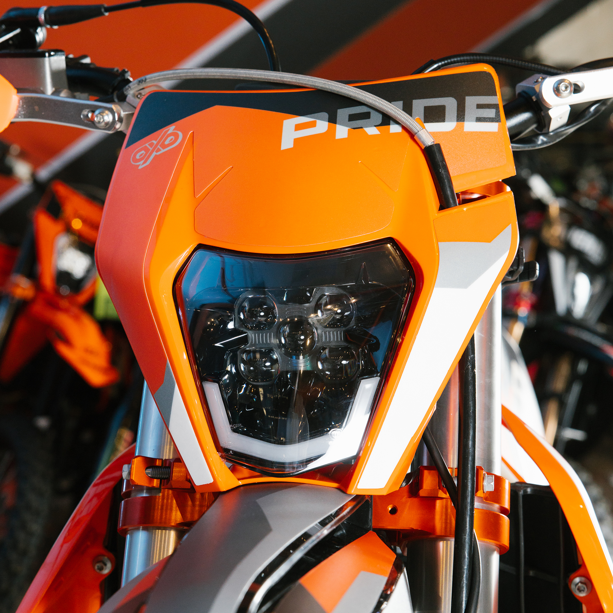 Электронная приборная панель, противоскользящее сиденье, защита рамы от протирания ботинками, подножки «AJ1» (алюминий 6063 с шипами), подножка боковая «AJ1» (алюминий 7075-Т6), невозгораемый воздушный фильтр «AJ1» – Twin Air с увеличенной площадью, ведомая звезда «AJ1» (520, алюминий 7075-Т6), защита рук, грипсы OTOM/Lock-On, передние и задние буксаторы «AJ1», откидные алюминиевые рычаги 270°, алюминиевая лапка КПП, пульт света КТМ, LED фара 5 линз, моточасы, фрезерованная траверса X trig .