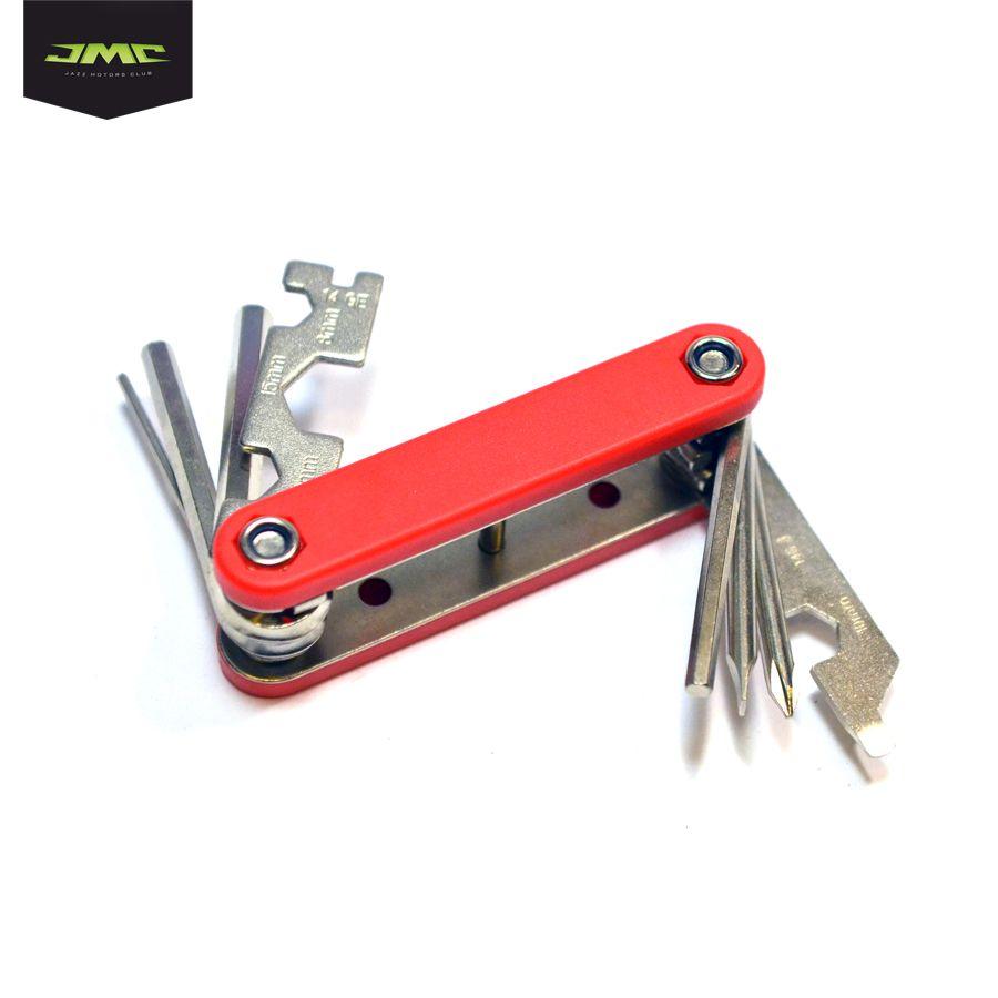 Универсальный, компактный мультитул включает в себя набор шестигранников (2/4/5/6), накидные ключи (8/10/15) и 2 отвертки.